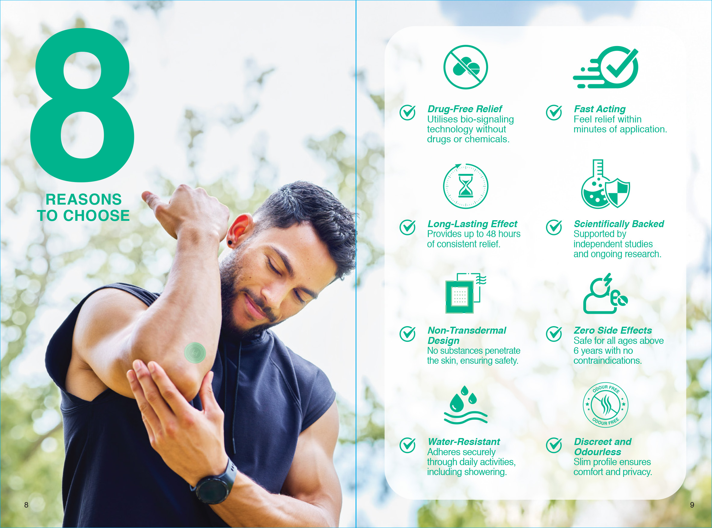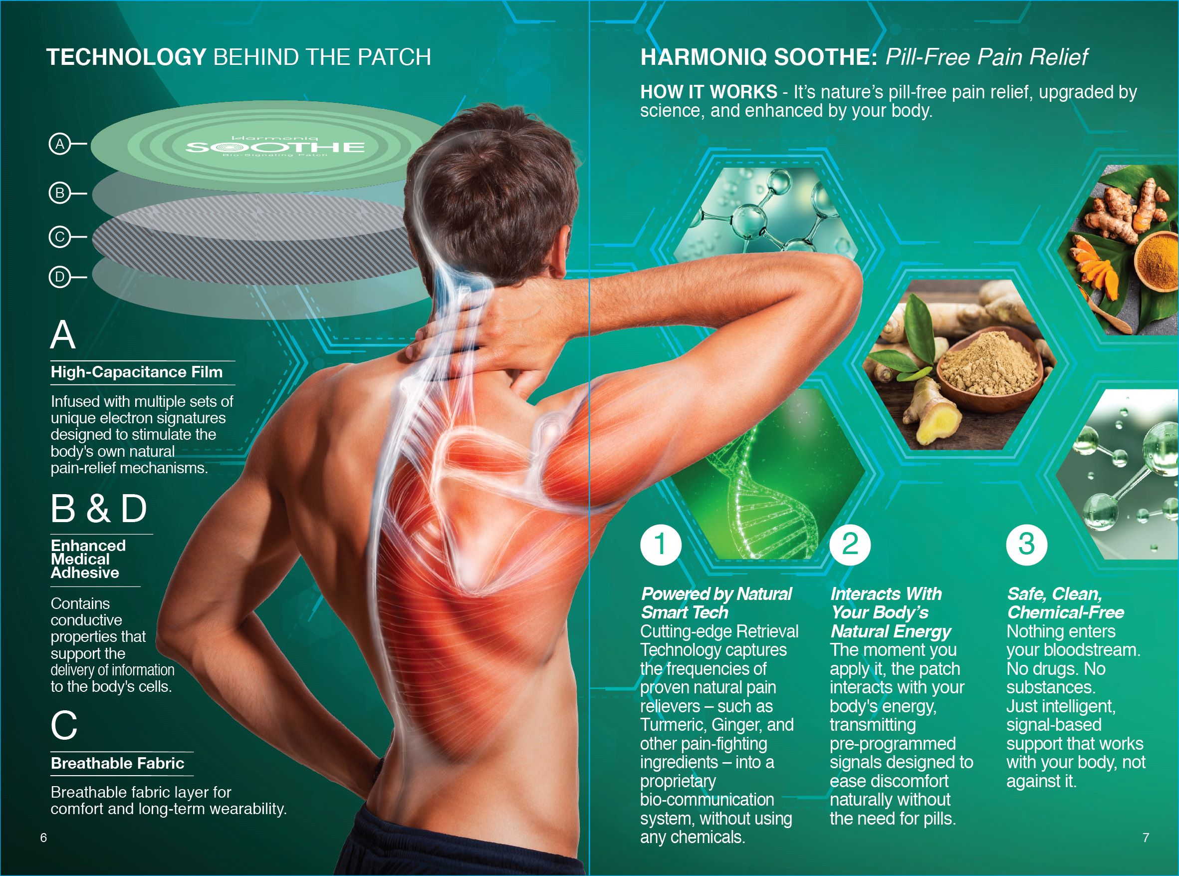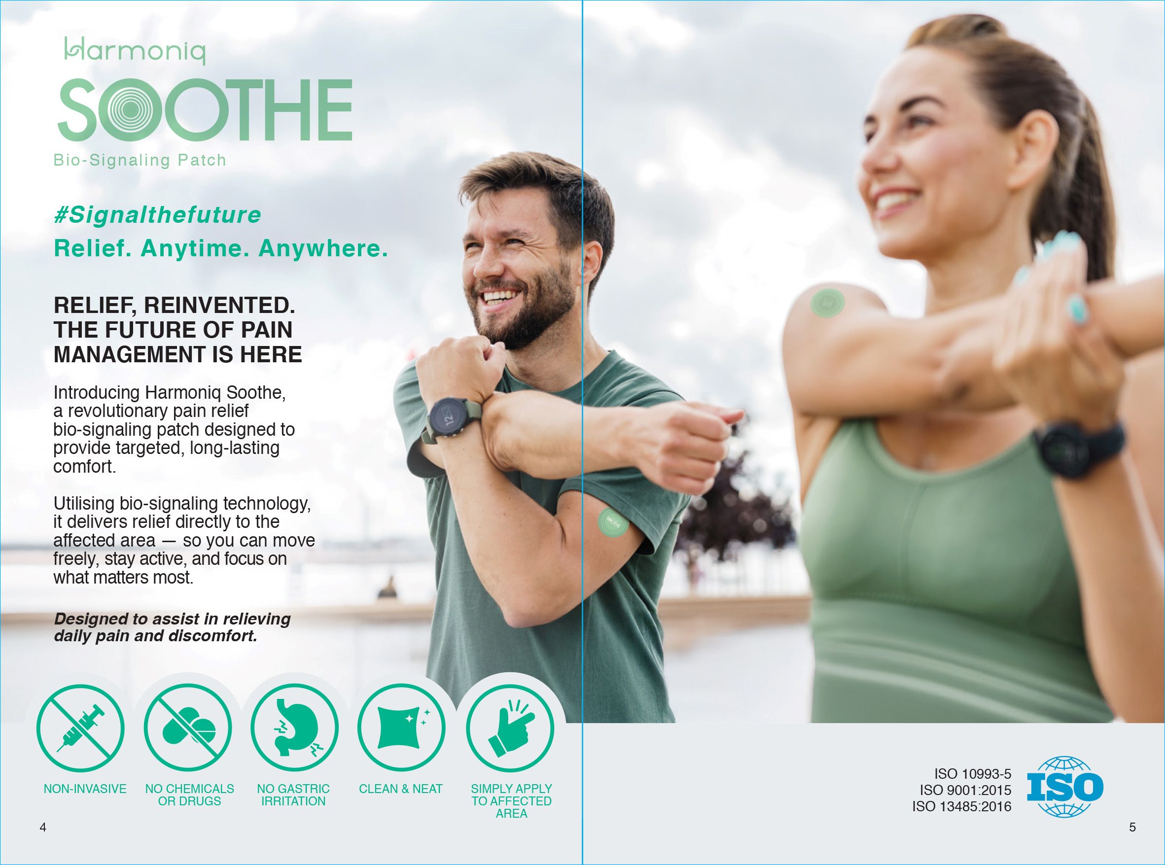 HARMONIQ Soothe is a drug free, non-invasive revolutionary bio-signaling patch designed to provide targeted, long-lasting comfort. Utilizing advanced bio-signaling technology, it addresses discomfort at its source - so you can move freely, stay active, and focus on what matters most.